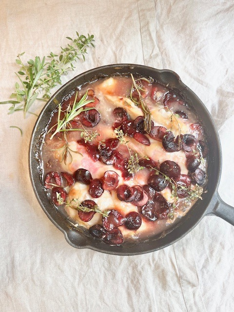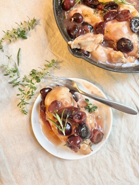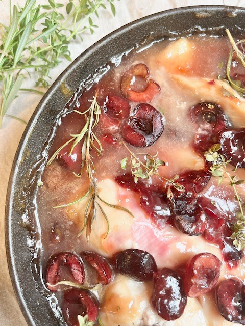 This baked cherry chicken is light and fruity yet also so savory. A perfect summer dinner and a great way to use up those fresh cherries!